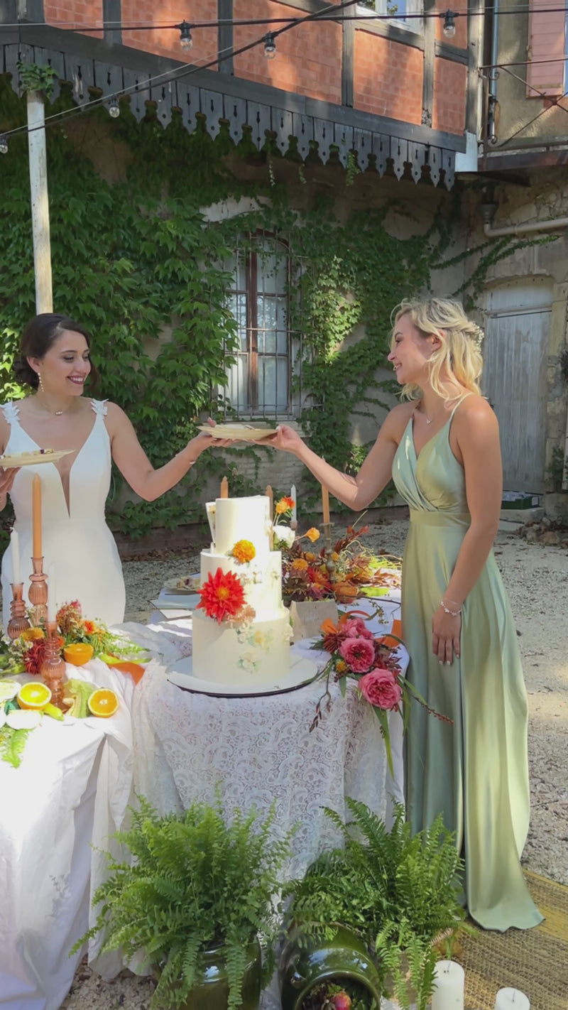 Quand la mariée partage une part de gâteau avec sa demoiselle d’honneur… et que les regards s’illuminent. C’est ce que nous voulons créer : des gâteaux qui rassemblent, qui touchent le cœur et rendent chaque instant inoubliable